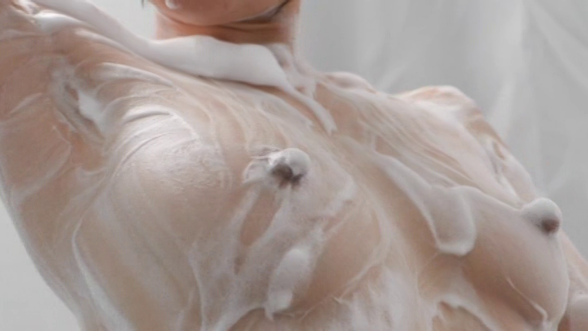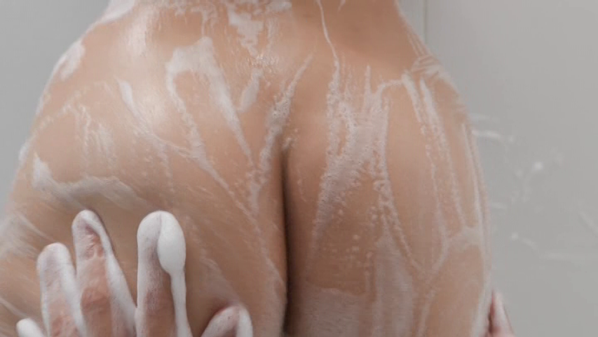 次は、シャワー室で泡まみれになっているまんげつさんの体を洗い、さらに胸をマッサージします。
