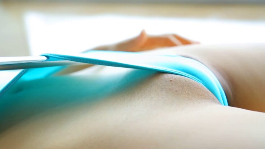 タンクトップをまくり上げてセルフマッサージするときも輪チラ。