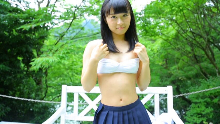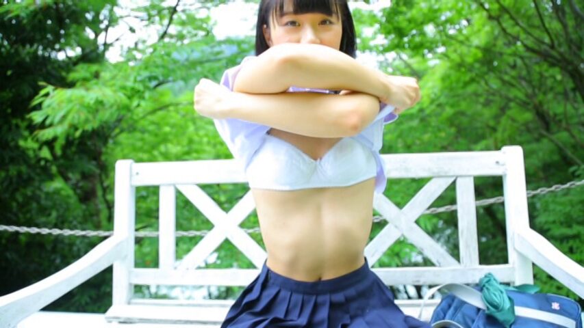 制服を脱ぐと純白の下着をずらし、手ブラと半ケツを見せています。