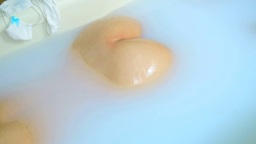 風呂では水着を引っ張って股間が際どいことになり、泡だけで胸を隠す姿を披露しています。