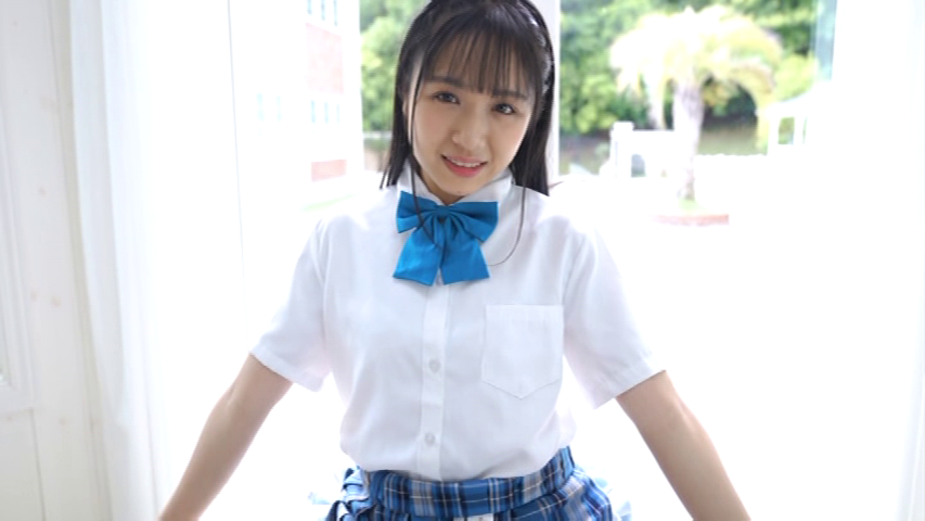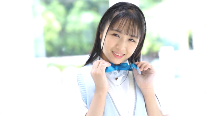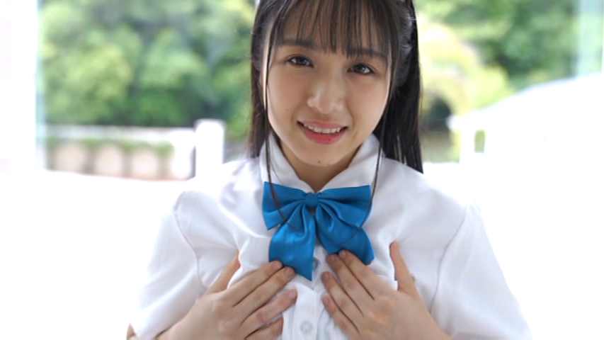 制服のシーンからスタートするとスカートをまくり上げてパンツを見せたり、リボンをつけたまま上半身裸になると手ブラを披露します。