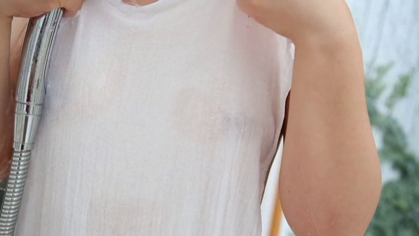 バランスボールに乗りながらシャワーを浴びると、泡越しにチク透け。