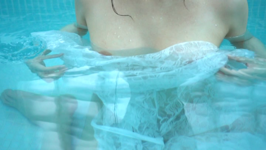 最後のシーンではローションをたっぷり使って透けさせたり、手ブラして全裸姿になっています。