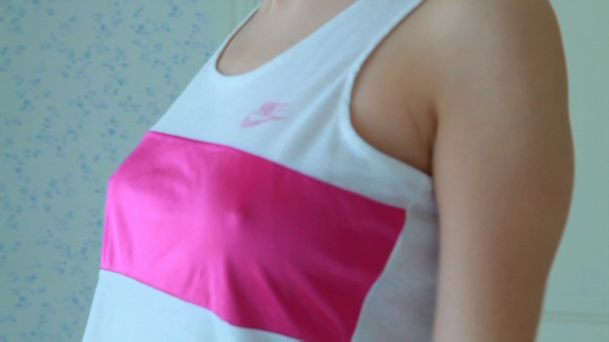 そして次のタンクトップ姿ではチューブを使って運動しますが、ノーブラのためチクぽちしています。