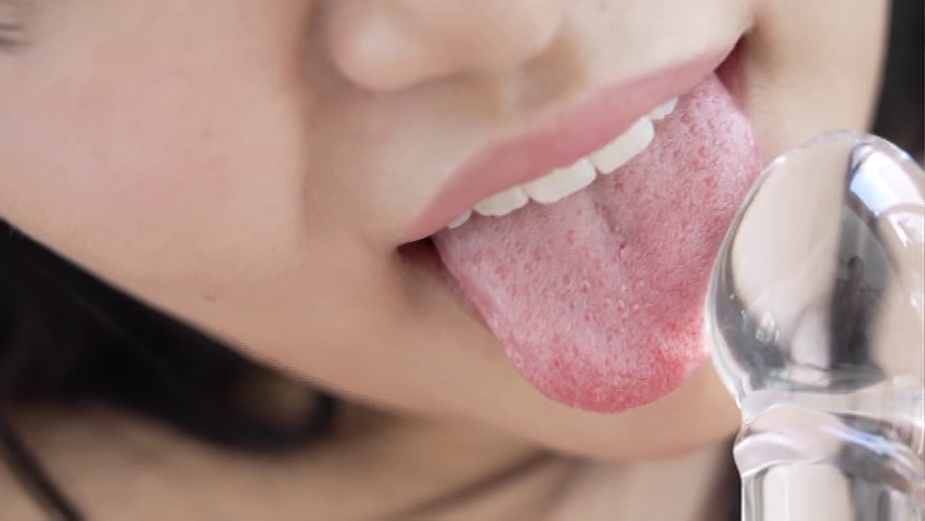 その後ソファに深く座りながらガラス棒を舐め、それを使って胸や股間をなで回します。