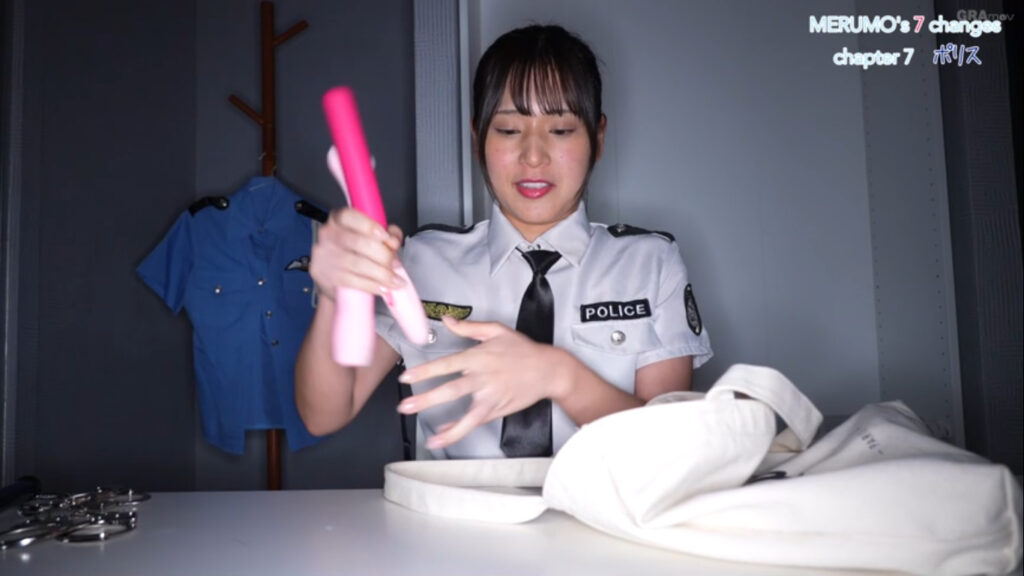 取り調べでおもちゃを見つけると、そのおもちゃで攻められてしまいます。「もう無理」と言いながらストッキングを使って胸や股を限界まで当てられてしまいます。
