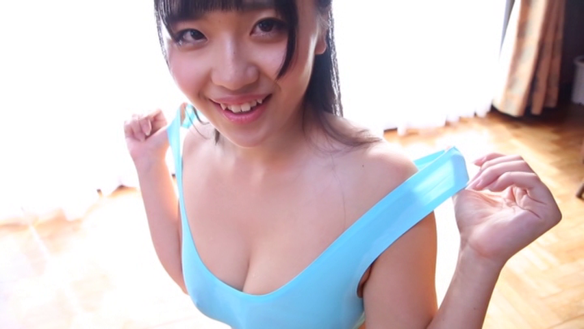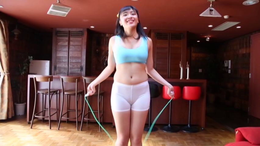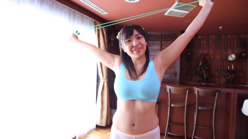 続くタンクトップ姿ではストレッチすると大きな胸が揺れ、胸や股が透けてしまうギリギリ演出。