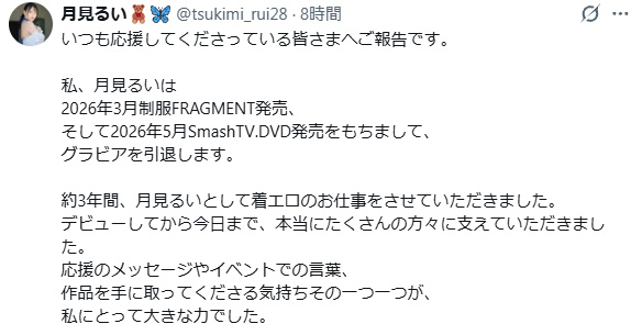 「私、月見るいは 2026年3月制服FRAGMENT発売、 そして2026年5月SmashTV.DVD発売をもちまして、 グラビアを引退します。」