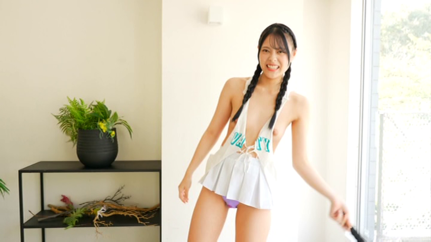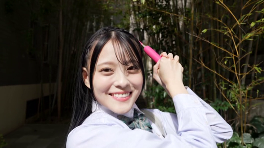 その制服を脱いで下着姿を披露すると、さっそくおもちゃが登場し胸に当てられます。