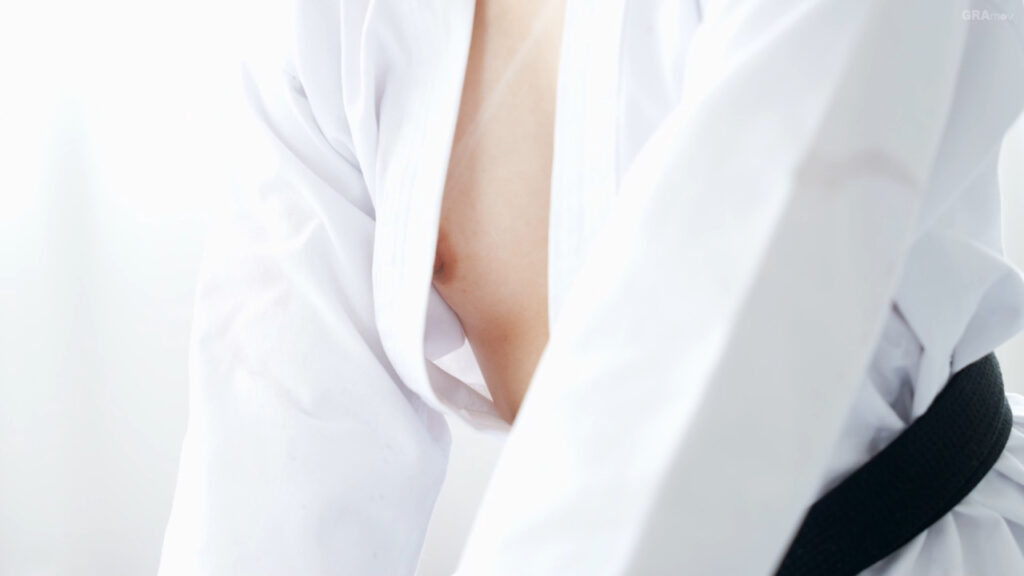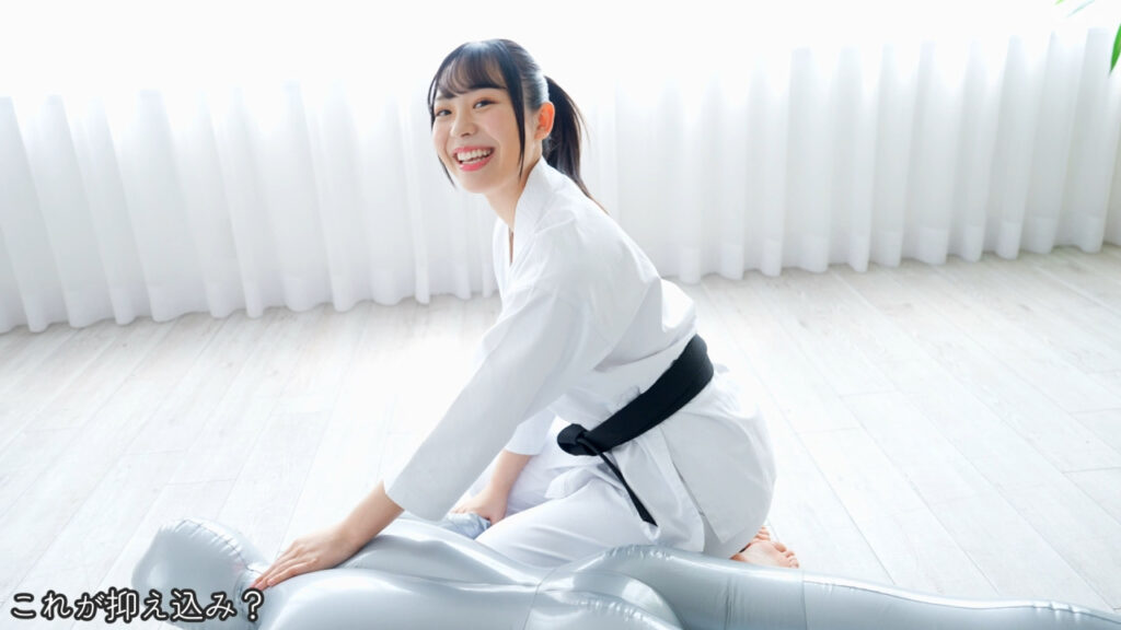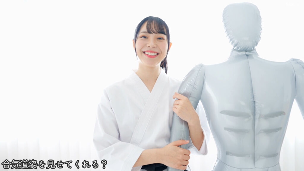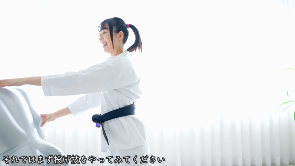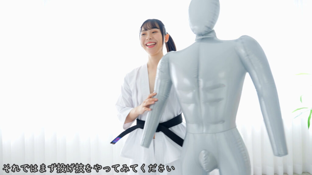 さらに合気道の姿になって人形相手に豪快に投げ飛ばします。