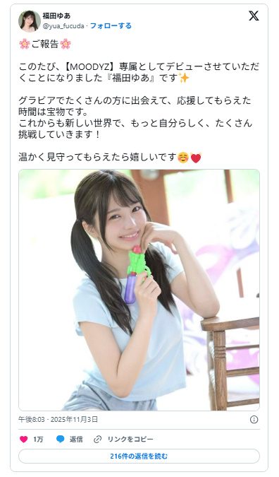 朝霧ましろさんはXで、『福田ゆあ』としてMOODYZ専属としてデビューすることを報告しています。
