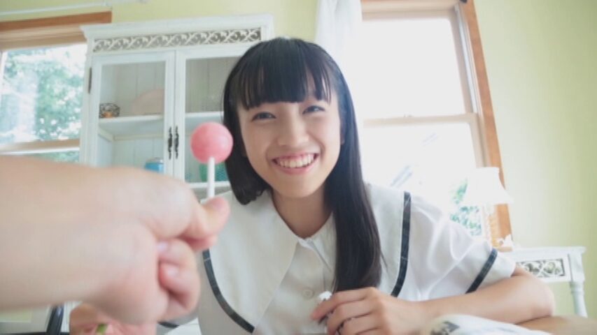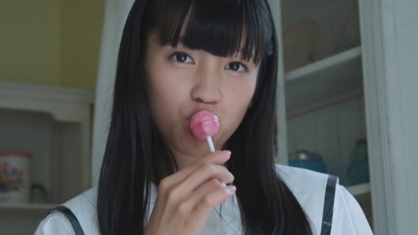 制服シーンでは、飴を舐めながら縦に割れた股間を見せます。