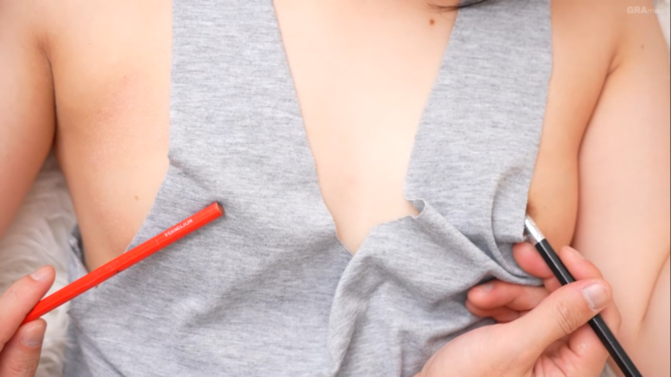 GRAmovと言えば、ギリギリの際どい露出やおもちゃをたくさん使ったりする刺激的な演出作品が多いのですが、このシリーズは着エロの原点に立って、透けやポロリなどをおもに楽しめる緩やかな作品になっているということだと思います。