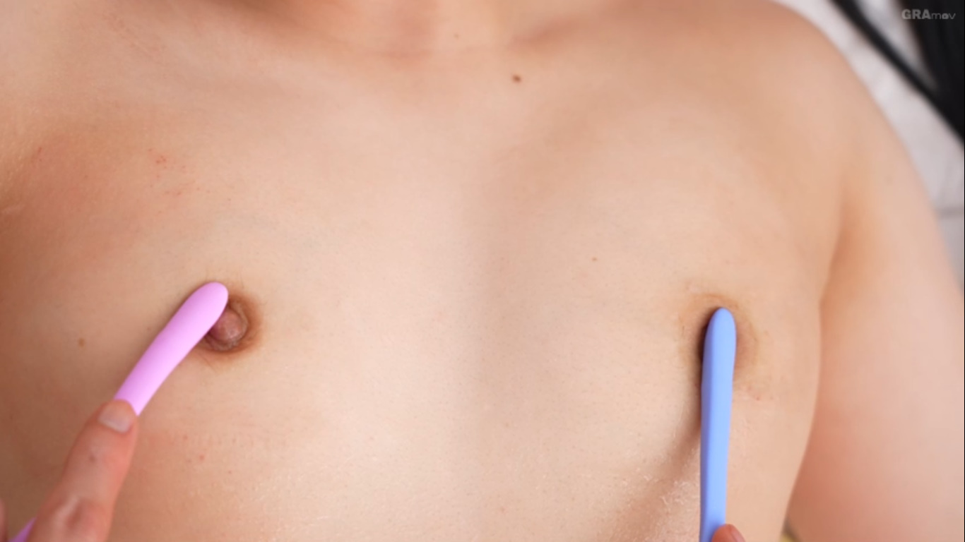全裸で手ブラしたり、ゆるゆるタンクトップからは両チクが見えていたり、おもちゃを当てられたりマッサージされるときも連続ポロリしています。