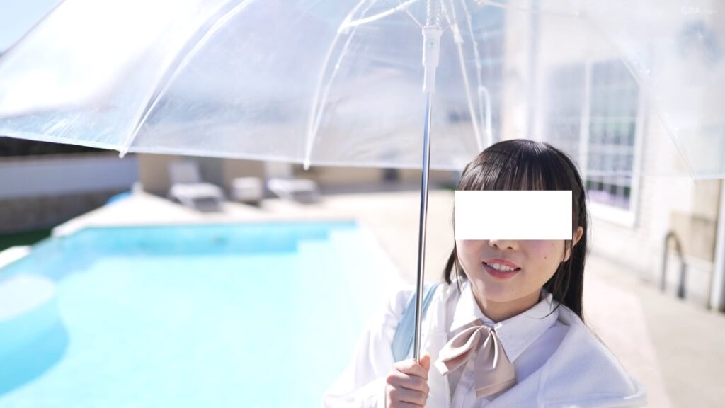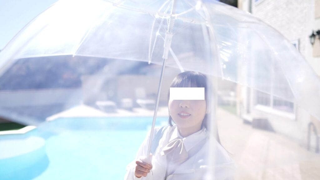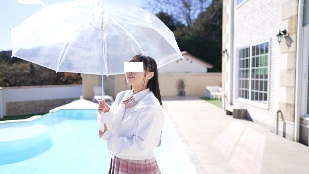部屋では透明の傘で隠しながら制服を脱ぐと、当然のことながらマル透け。