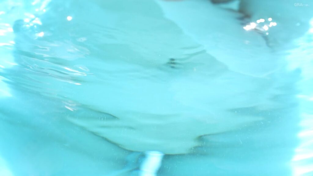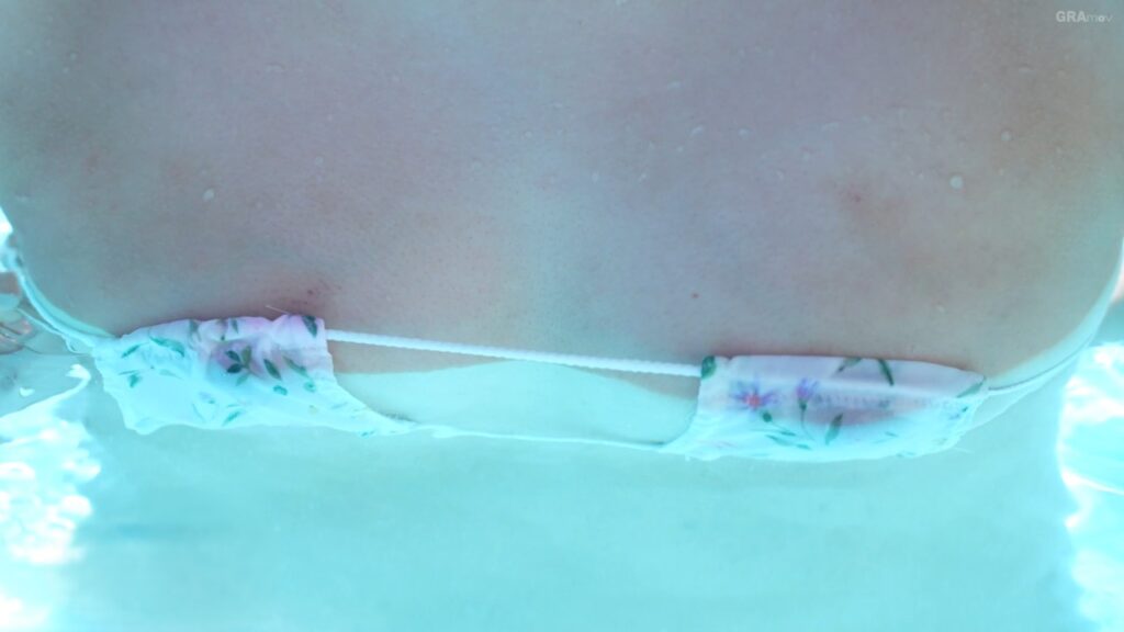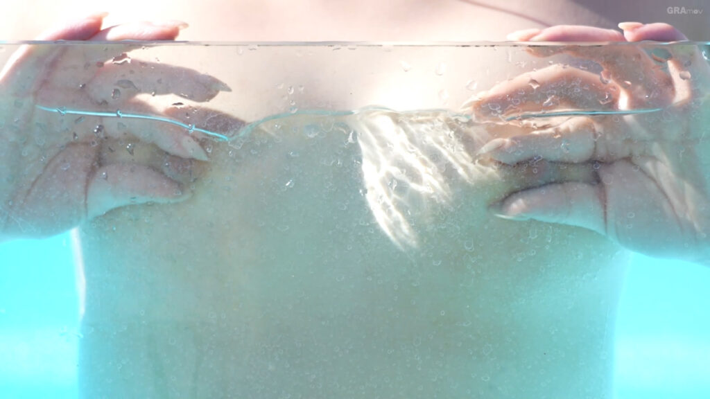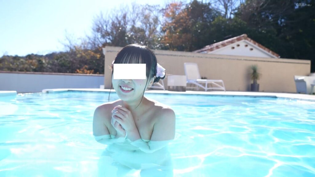 たとえばプールの中で全裸になると、明るい日差しの中で胸を水面から出したり、ガラスの壁に全裸の体を押し付けて全身丸見え。