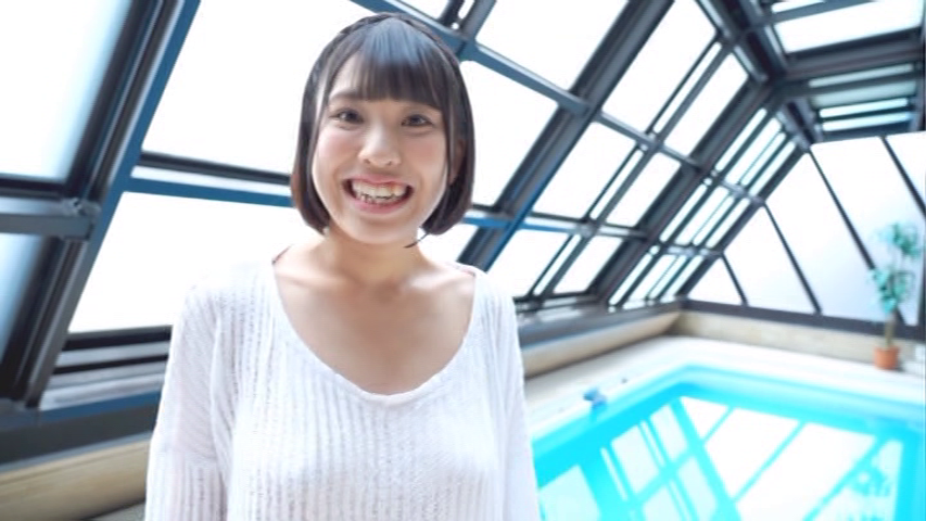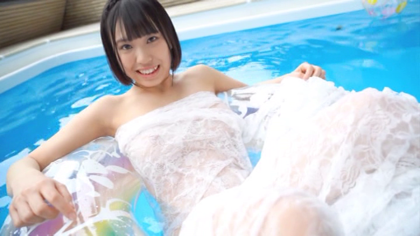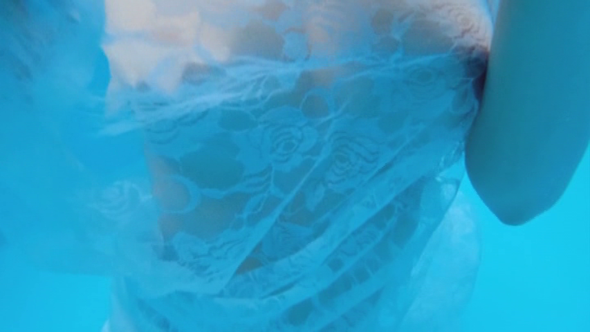 服を脱ぐとFカップのバストを披露し、シースルーの布を纏ってプールを泳ぎ回ります。