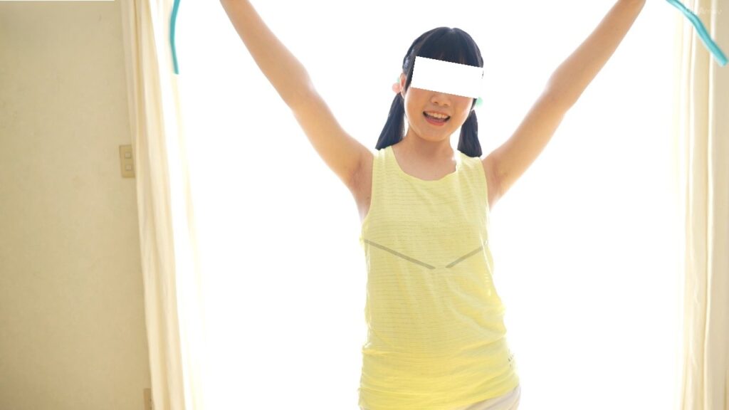 タンクトップを脱ぐと面積小さめの水着を着ていて運動を始め、