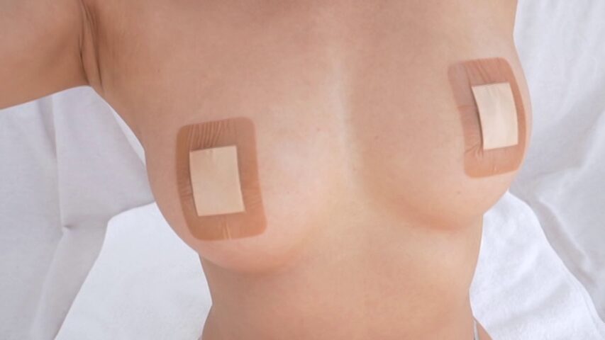 服を脱ぐと絆創膏を胸に貼った姿になり、ローションマッサージされます。