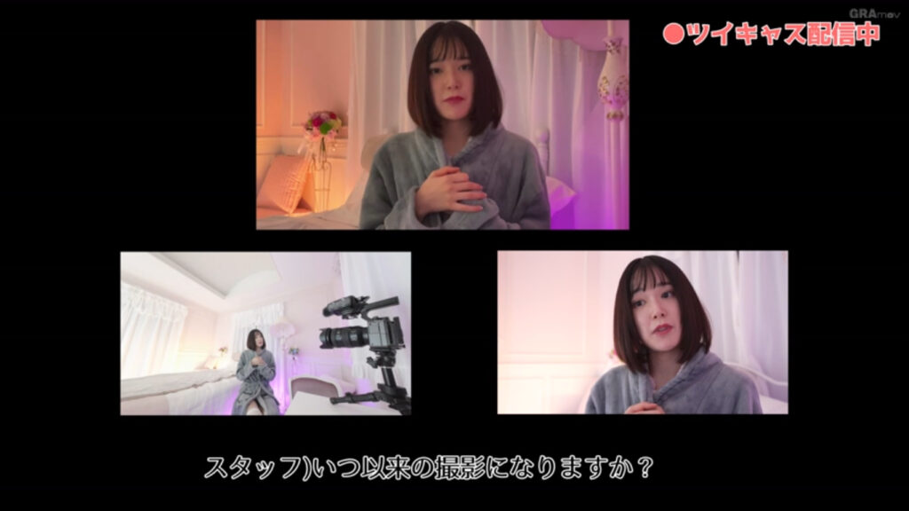 撮影の途中での配信で、着エロ出演は実に4年ぶりで、久しぶりの撮影で緊張していることを語ります。