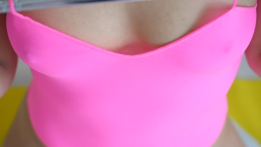 身体の柔らかい純奈さんがレオタードを着て運動するシーンから始まるのですが、生地が薄いためチク透けしています。
