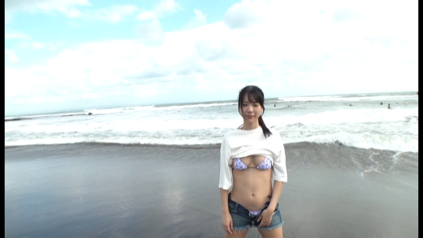 そのようにインタビューが終わると、海岸でTシャツ姿から水着になるシーンになります。