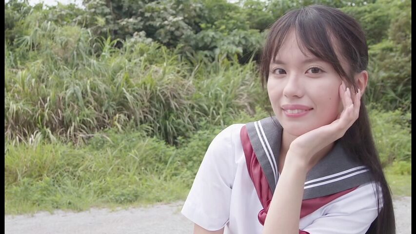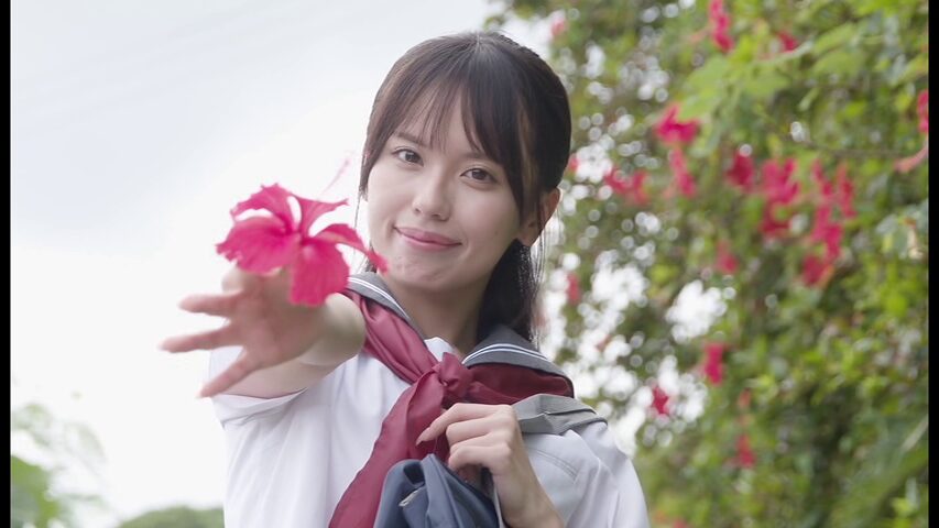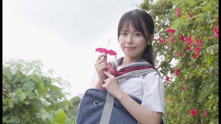 大自然の中で、ハイビスカスの花に囲まれて制服姿になってスタートします。