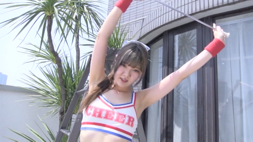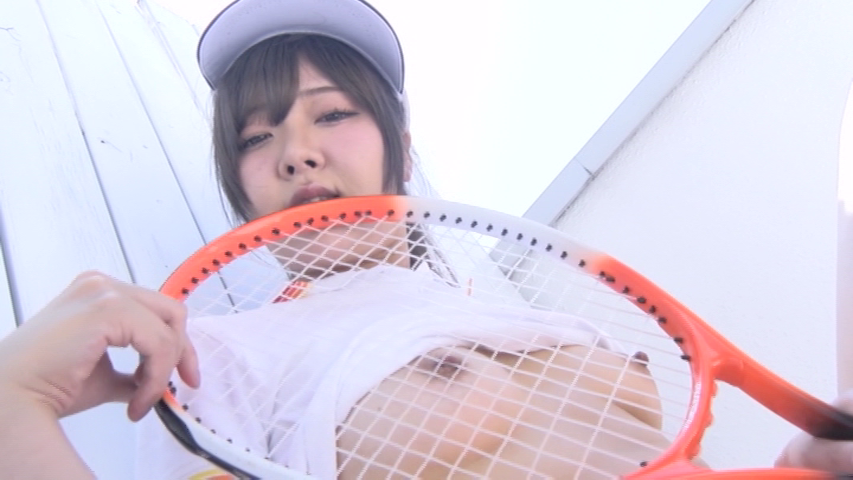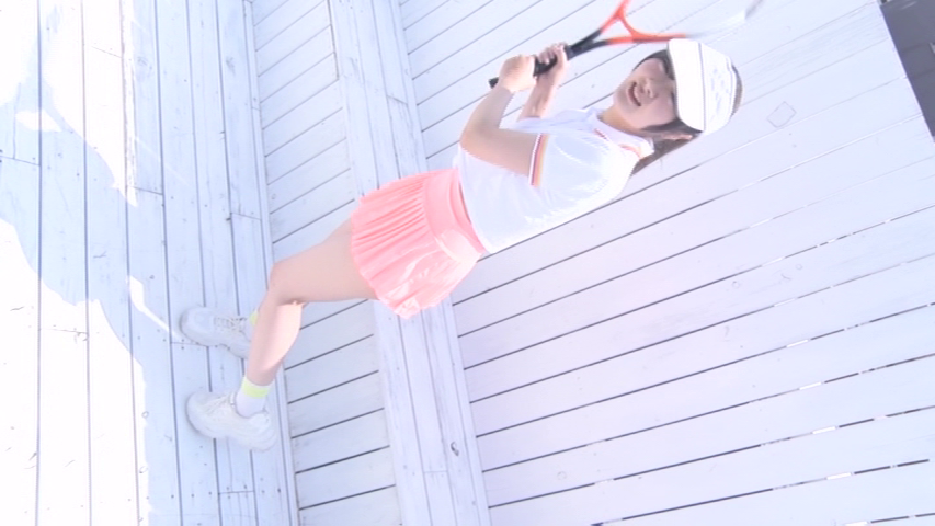 最初は白い壁が特徴の屋上シーンで始まり、キャップをかぶり少しまぶしそうにしながらラケットを素振りしてパンチラします。