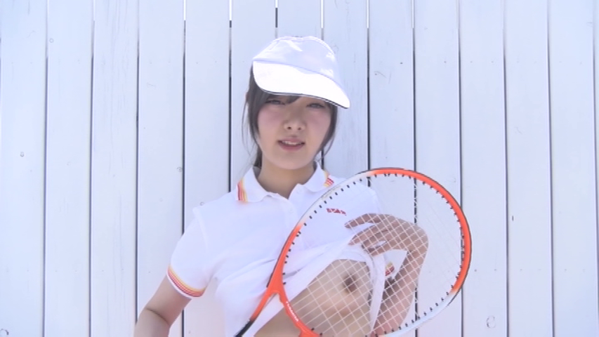 さらに服をまくり上げて胸を見せたり、ラケットの柄だけで股間を隠し、きれいなお股を見せます。