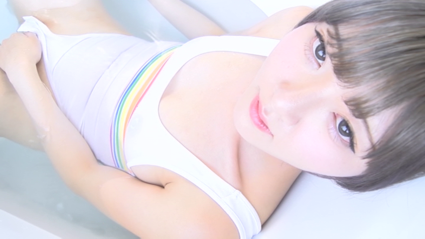 次の短くカットされた体操服を着たシーンでは、パンツを脱ぐと花を挿した花瓶で股間を隠します。