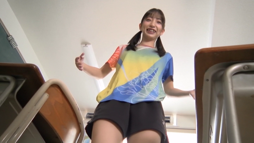 三田真由子さんが教室の中で卓球の姿で登場すると、いきなりシャツを上にあげて胸をチラリ。