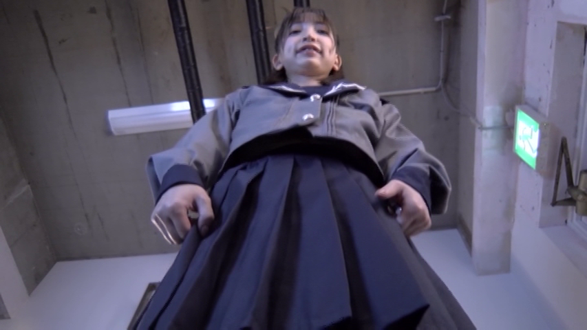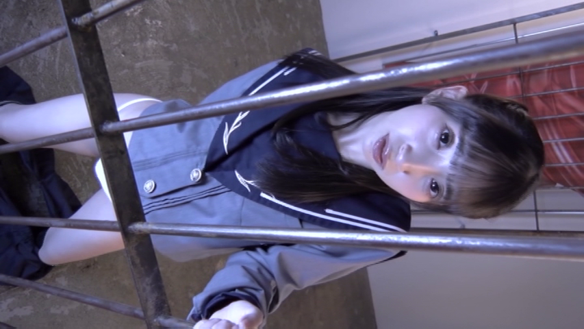 制服シーンでは、ガラスで股を隠した状態で手を使って中をオープン。