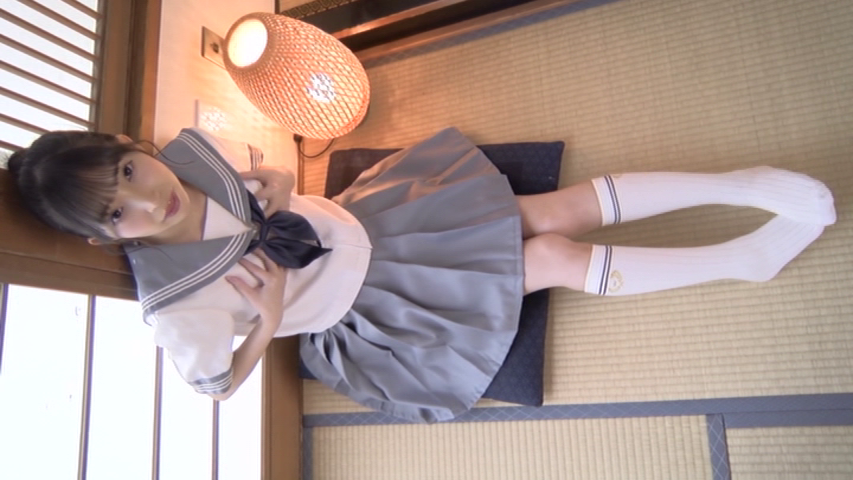 制服姿では胸を見せながらオナニーを始め、水着のシーンでは全裸になり、手で股間だけを隠してM字開脚します。