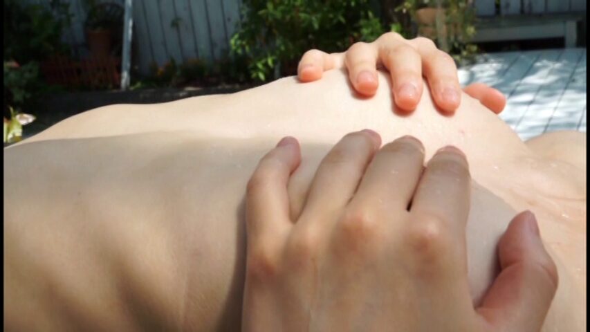 庭でバランスボールの上に座って足を開くと、パンツに大きなシミが…