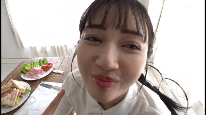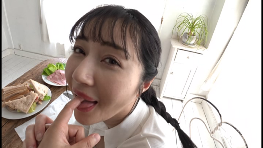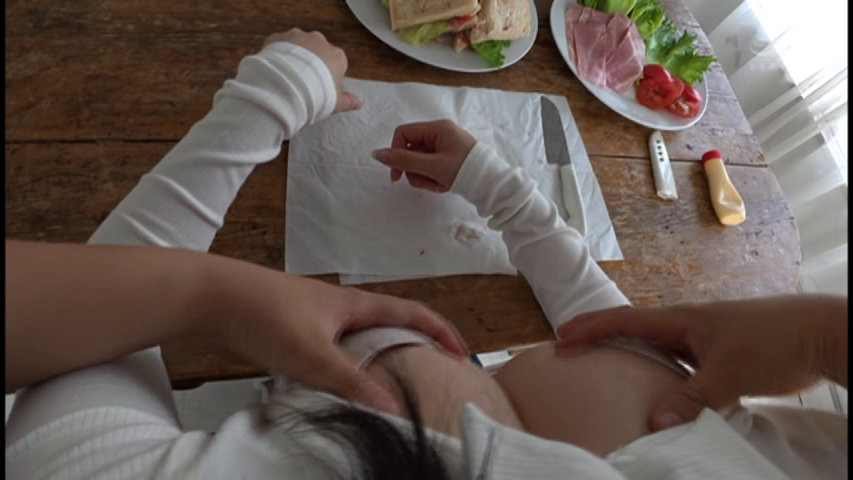 サンドイッチを作る流れからマッサージされ、最後のシーンではセルフマッサージして透けチクやチクちらを見せています。