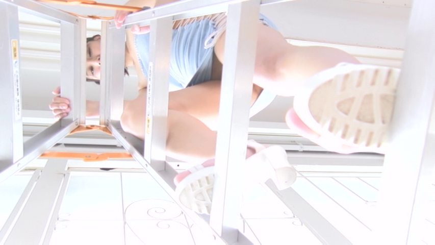 そして次の屋内シーンでは脚立が登場し、それに乗って足を開いて前貼りの股を披露。