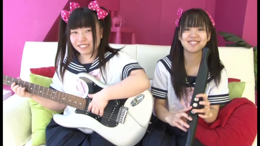 制服姿で楽器を奏でるそぶりを見せると、二人で一緒にスカートを下ろし始めてレオタード姿に。