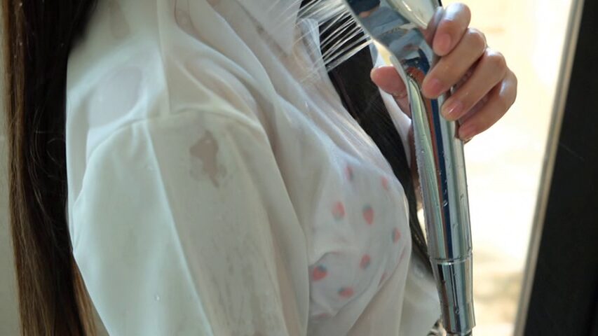 シャワールームに入ると、なんと制服を着たまま浴び始め、イチゴ柄の下着が透けて見えてしまいます。