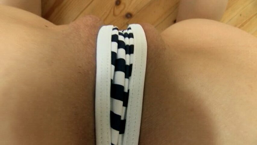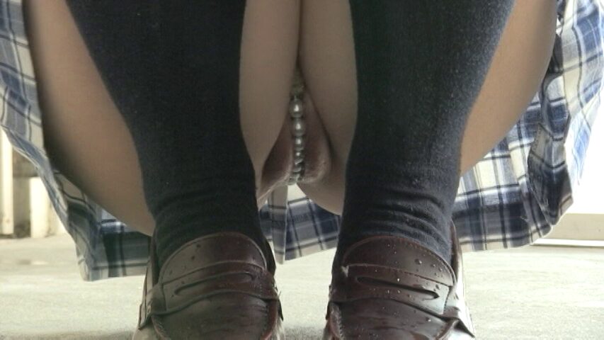 制服を着た逢坂音音さんをカメラが下からとらえると、パールが食い込んだ股間が見えます。
