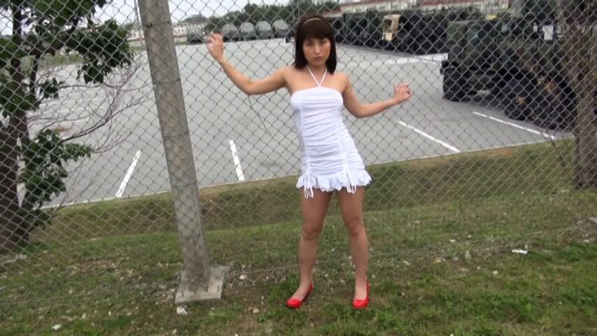 沖縄のキャンプハンセンのすぐ横をノーブラミニスカートで歩いてくる長谷川百花さん。