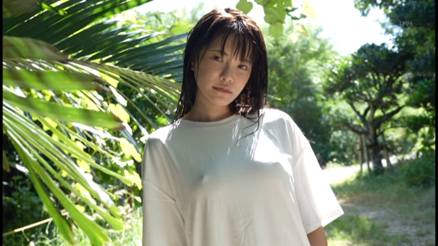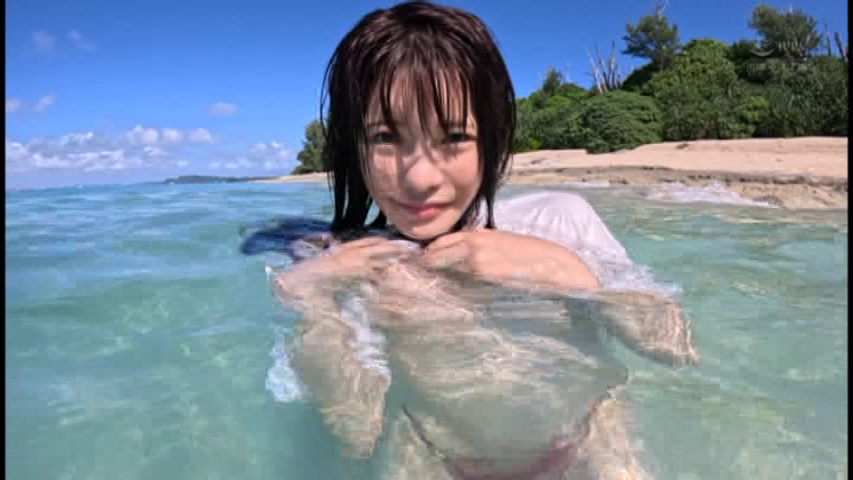 場面が変わってTシャツ姿で海に入ると、海の中でそれを脱いできれいな胸元を見せます。