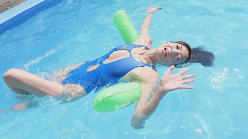 部屋に入るとセクシーな下着姿でポージングを見せ、プールでは競泳水着を着てきれいなプロポーションを披露します。